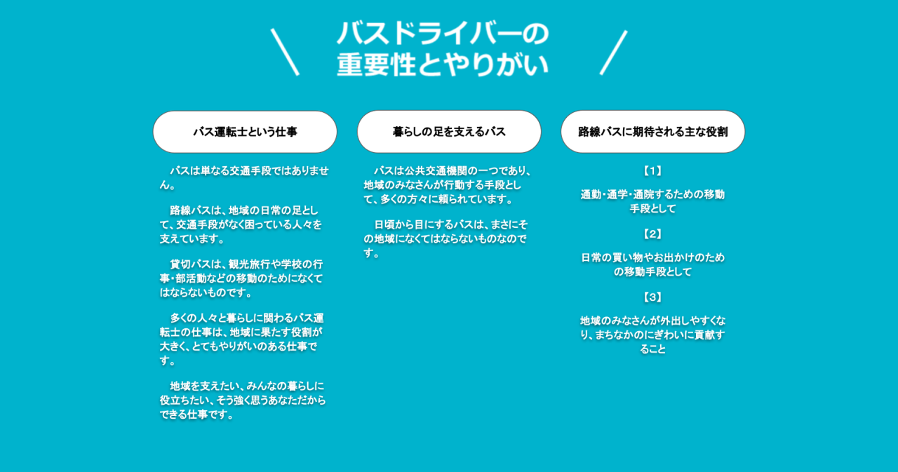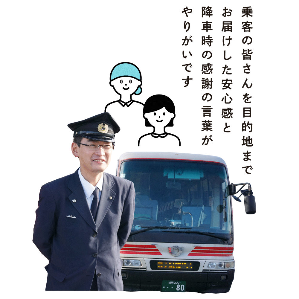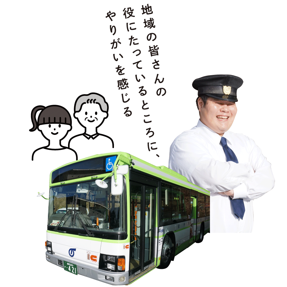 バス運転士は地域の交通インフラを支える社会貢献度の高い仕事です。お客様の笑顔、感謝は大きなやりがいになるでしょう。
